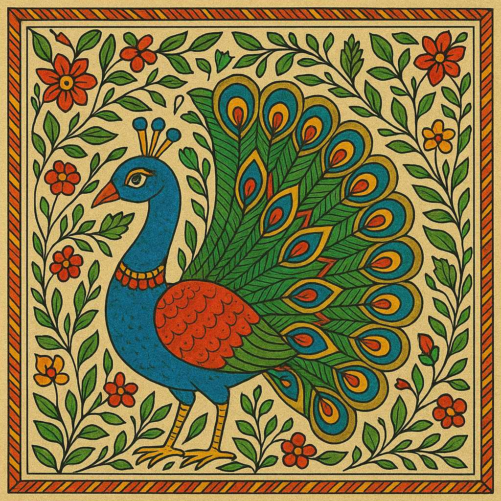 चलते-फिरते किसी दीवार पर नजर पड़ती है। एक चित्र है—रंग-बिरंगा, धागों से भी महीन रेखाओं से बना हुआ, जिसमें एक मोर बारिश में नाच रहा है 🦚। आप ठिठक जाते हैं। वो सिर्फ एक पेंटिंग नहीं लगती—वो किसी कहानी की तरह लगती है, जो चुपचाप आपकी ओर देख रही है।